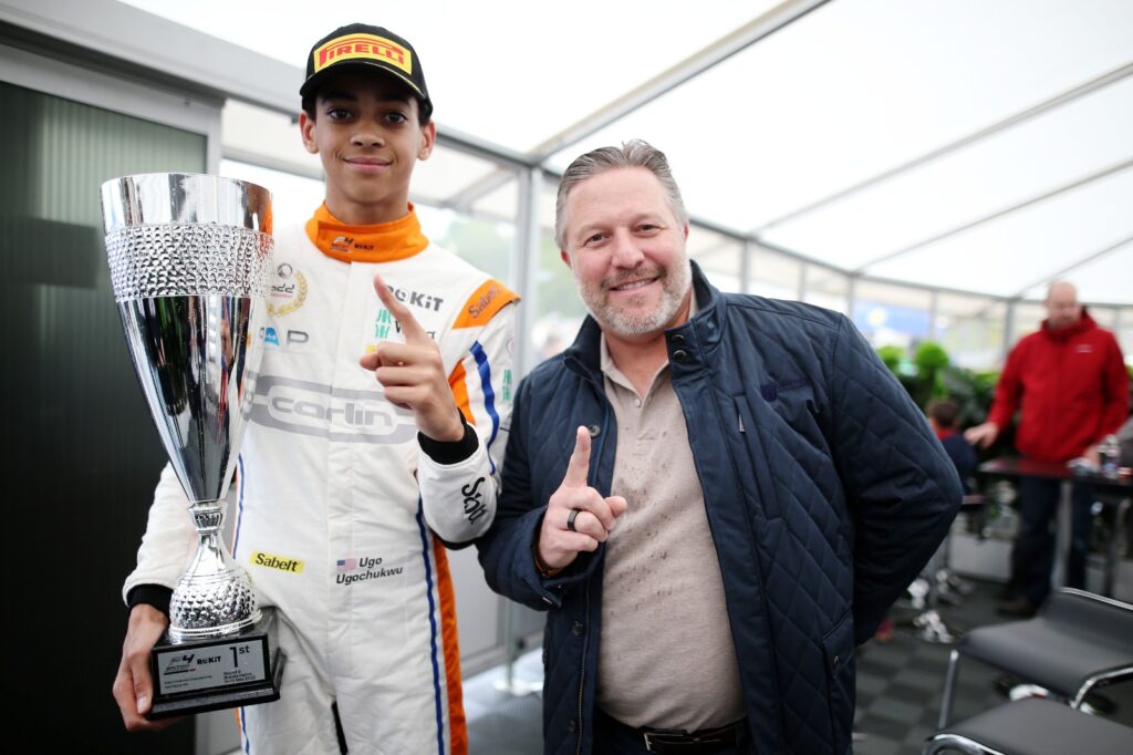McLaren junior Ugo Ugochukwu triumphed in a wet-weather blockbuster, leading home a Carlin 1-2-3 finish in the final ROKiT F4 British Championship certified by FIA race of the weekend at Brands Hatch.