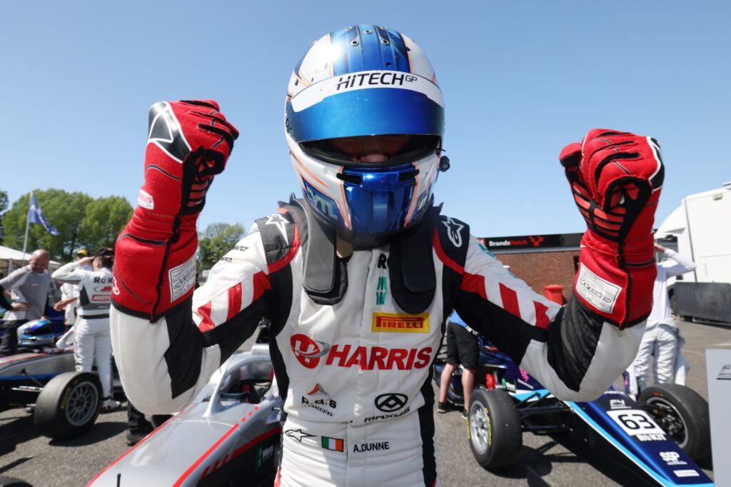 Alex Dunne took a third victory of the season for Hitech GP in the first ROKiT F4 British Championship certified by FIA race of the weekend at Brands Hatch, extending his early lead at the championship summit.