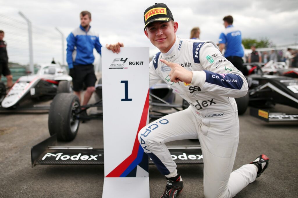 Carlin’s Oliver Gray made a superb move stick around the outside of Tower to score his first victory of the 2022 ROKiT F4 British Championship certified by FIA season in a curtailed and restarted Race 3 at Croft.