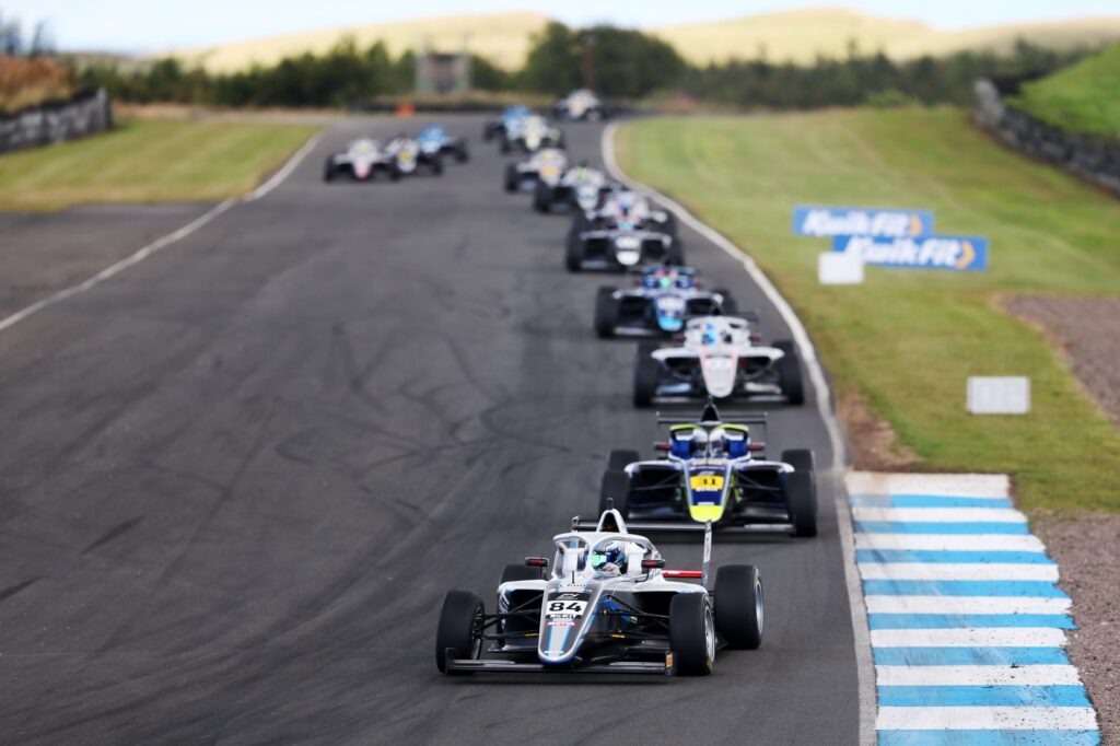 Eduardo Coseteng’s steady weekend in the Scottish countryside continued, the Hitech racer fending off Phinsys by Argenti’s Aiden Neate for fifth and sixth after a race-long scrap. Oliver Stewart (Hitech) took seventh and a popular Rookie Cup victory on home soil, delighting the local contingent out in force to support the Beauly-based racer.