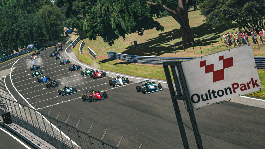 The virtual edition of Britain’s FIA Formula 4 series swapped the fast, sweeping turns of Donington Park for a tighter, more technical challenge in Oulton Park’s Island circuit, sponsored by Base Performance Simulators.